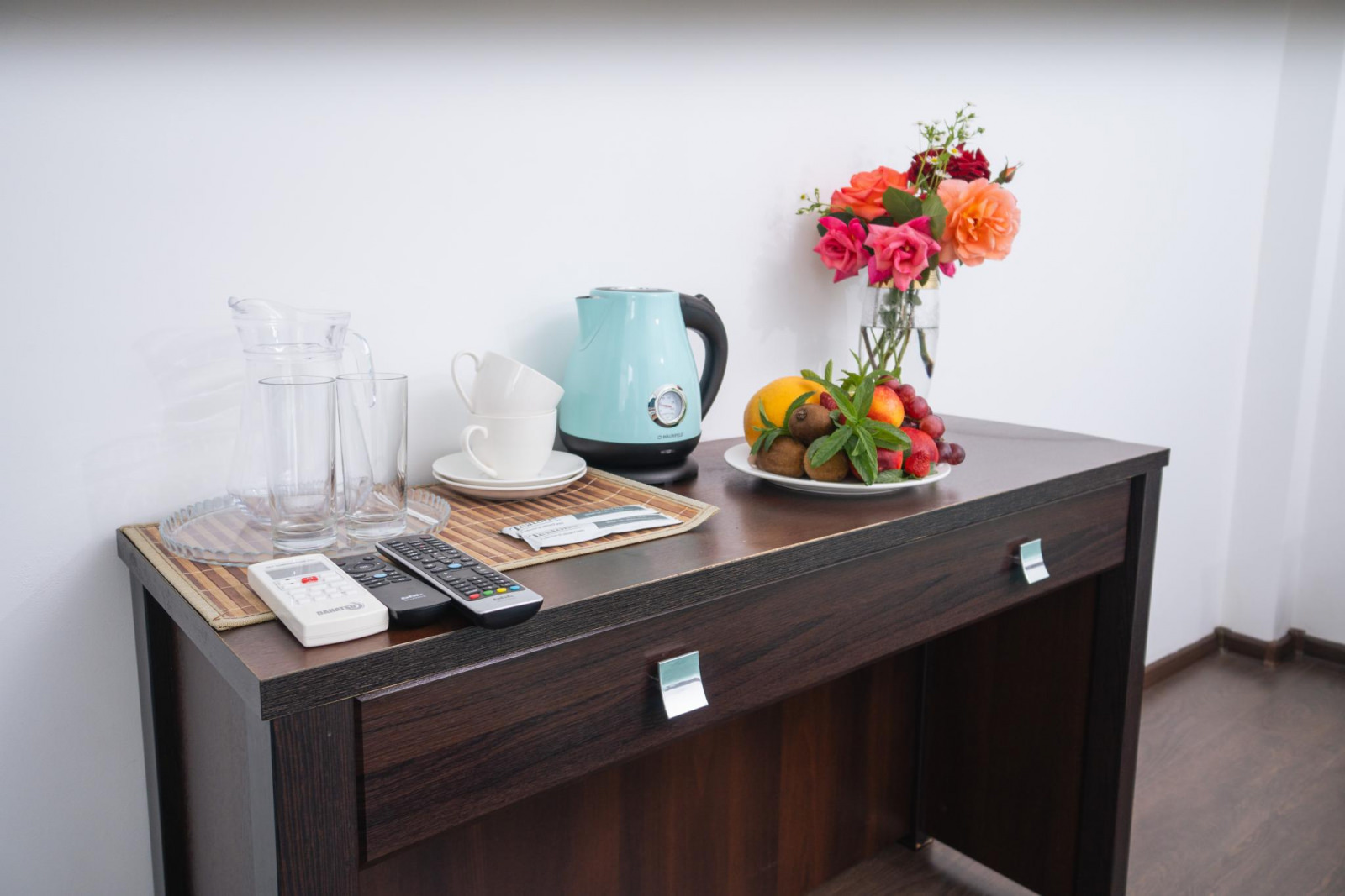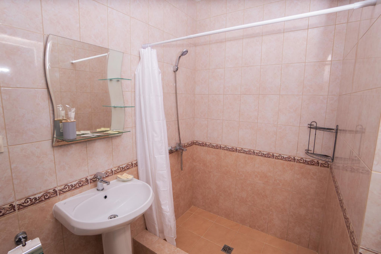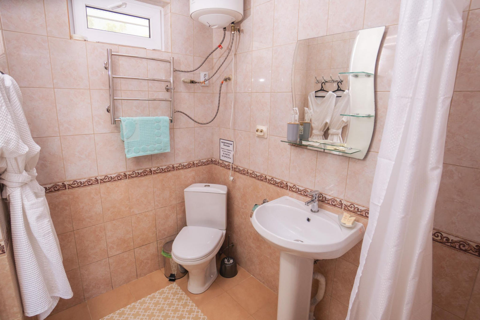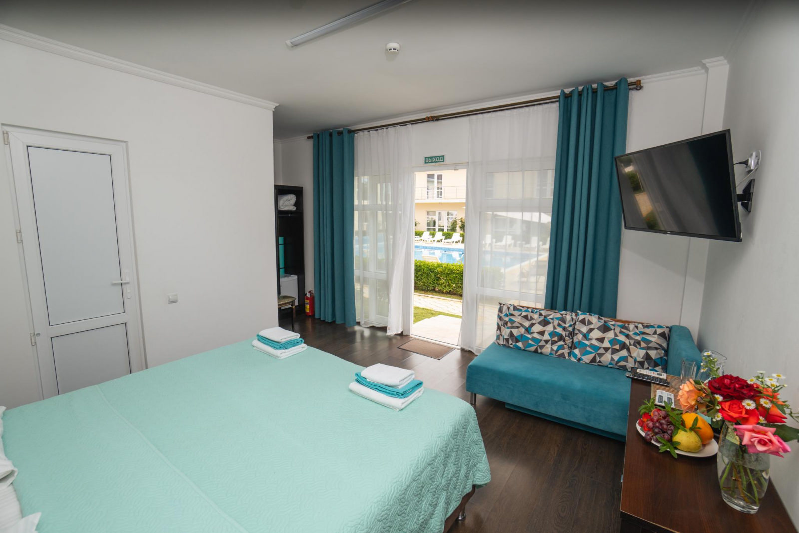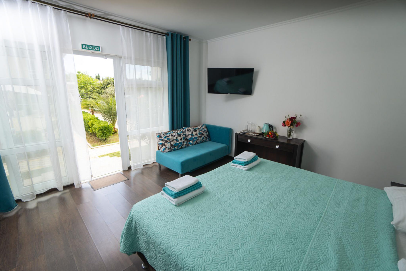 Размер номера 20 м² 1 большая двуспальная кровать с ортопедическим матрасом. К услугам гостей этого семейного номера есть собственная ванная комната с душем, феном, халатами и тапочками. В числе прочих удобств — кондиционер, телевизор с плоским экраном и кабельными каналами, отдельный вход, шкаф для одежды, сейф, минихолодильник, чайник В распоряжении гостей 1 двухспальная кровать и 1 диван-кровать на одну персону.
